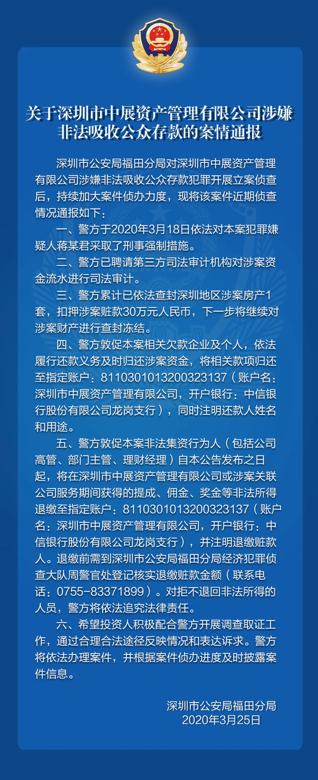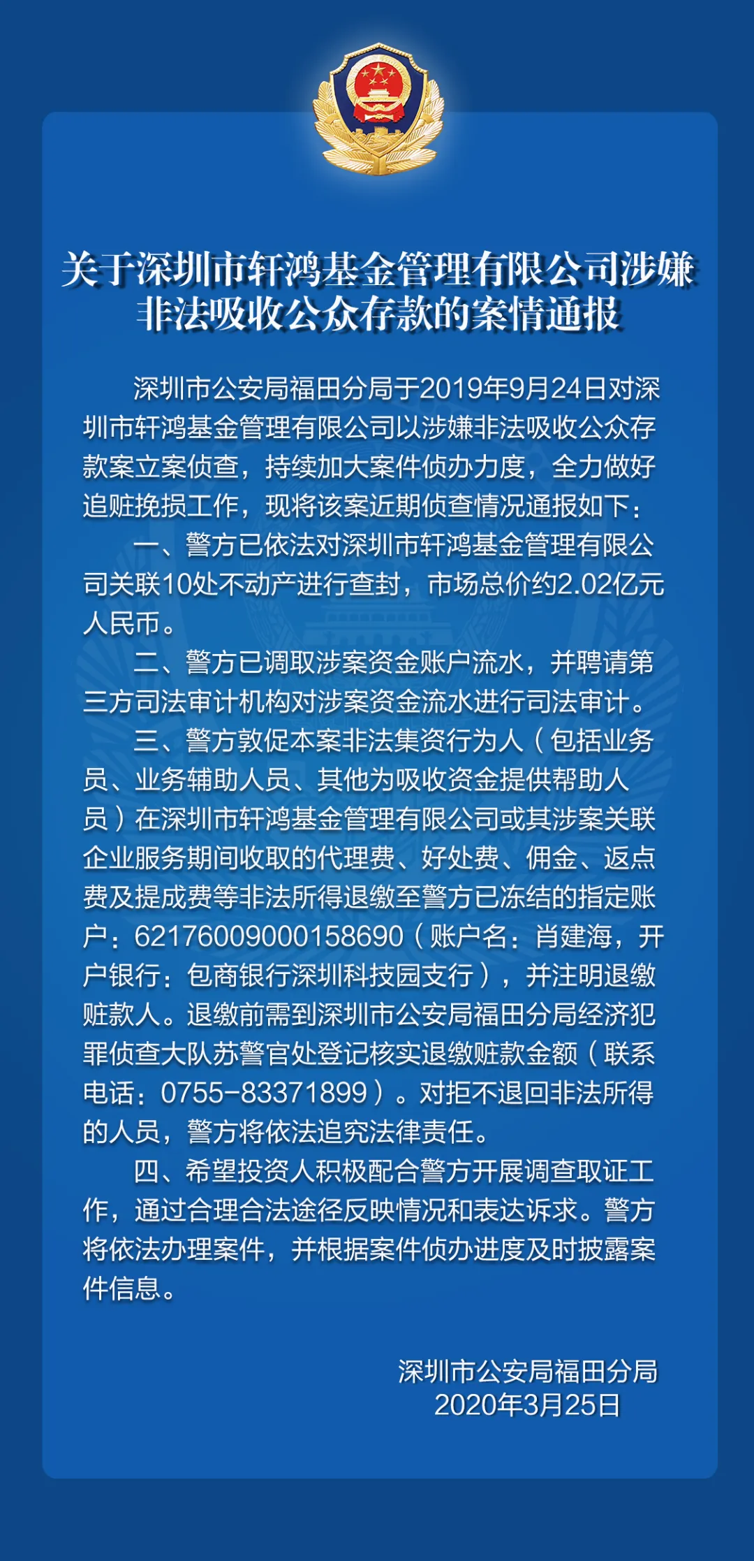 關(guān)于深圳市軒鴻基金管理有限公司、深圳市中展資產(chǎn)管理有限公司涉嫌非法吸收公眾存款的案件情況通報