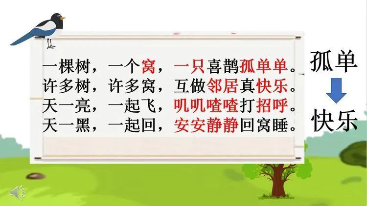 在劉老師的課堂上,她帶來《樹和喜鵲》故事中主人公小喜鵲日記本獎勵讀書流利、情感充沛的孩子們。通過小喜鵲的日記,婉儀老師將課堂成功地轉(zhuǎn)接到課文的文本當(dāng)中。進(jìn)而有對文章中出現(xiàn)的事物、事物所具備的特點(diǎn)展開了細(xì)致而有趣的學(xué)習(xí)。期間,婉儀老師還化身小記者,用三段對于自己學(xué)生的采訪視頻,讓學(xué)生對于“孤單”二字有了更加深刻的理解。