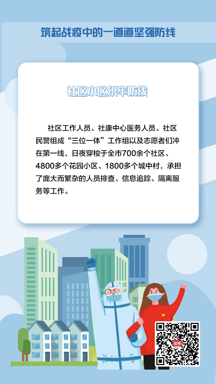 社區(qū)小區(qū)是“外防輸入、內防擴散”的有效防線,在這個關鍵戰(zhàn)場上,由社區(qū)工作人員、社康中心醫(yī)務人員、社區(qū)民警組成的“三位一體”工作組以及志愿者們沖在第一線,日夜穿梭于全市700余個社區(qū)、4800多個花園小區(qū)、1800多個城中村,承擔了龐大而繁雜的人員排查、信息追蹤、隔離服務等工作。