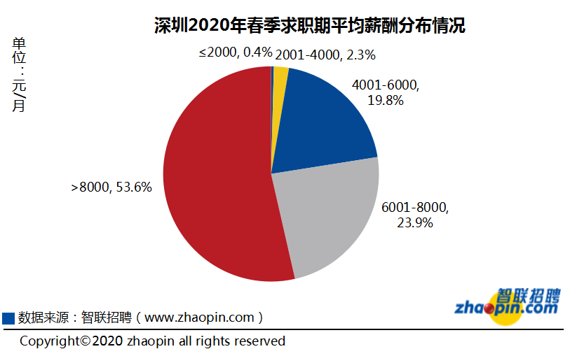 智聯(lián)招聘在線數(shù)據(jù)顯示,深圳地區(qū)2020年春季求職期的平均薪酬為10616元/月,在全國38個主要城市的薪酬水平中排名第三位,薪酬水平較上一季度略有上升,排名沒有變化。從薪酬的分布情況來看,深圳地區(qū)薪酬水平很高,8000元以上/月的職位在職位總量中占比達(dá)53.6%,占比較上一季度有所上升,平均月薪6001元/月至8000元/月的占23.9%。
