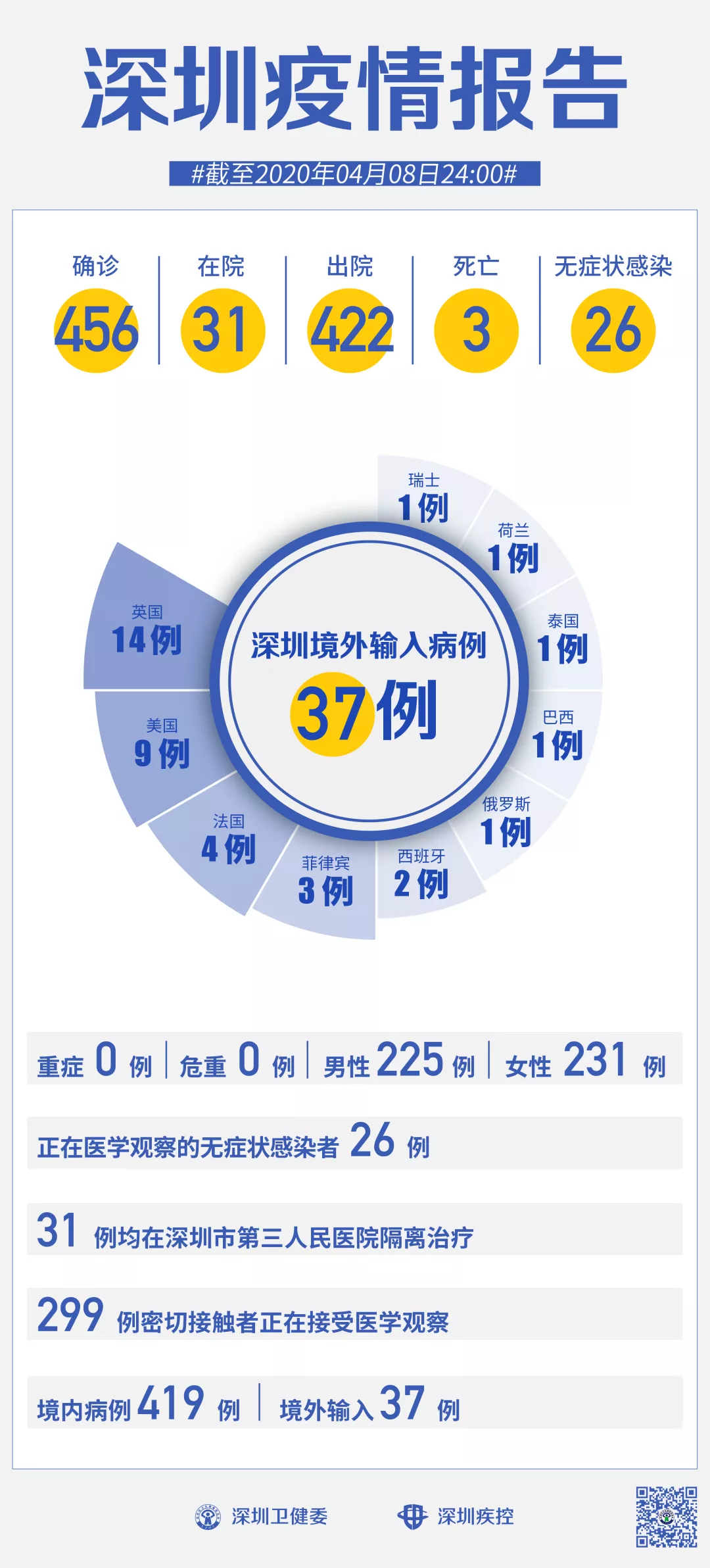 截至4月8日24時(shí),深圳累計(jì)報(bào)告新冠肺炎病例456例。4月8日當(dāng)天新增無(wú)癥狀感染者1例,出院1例。