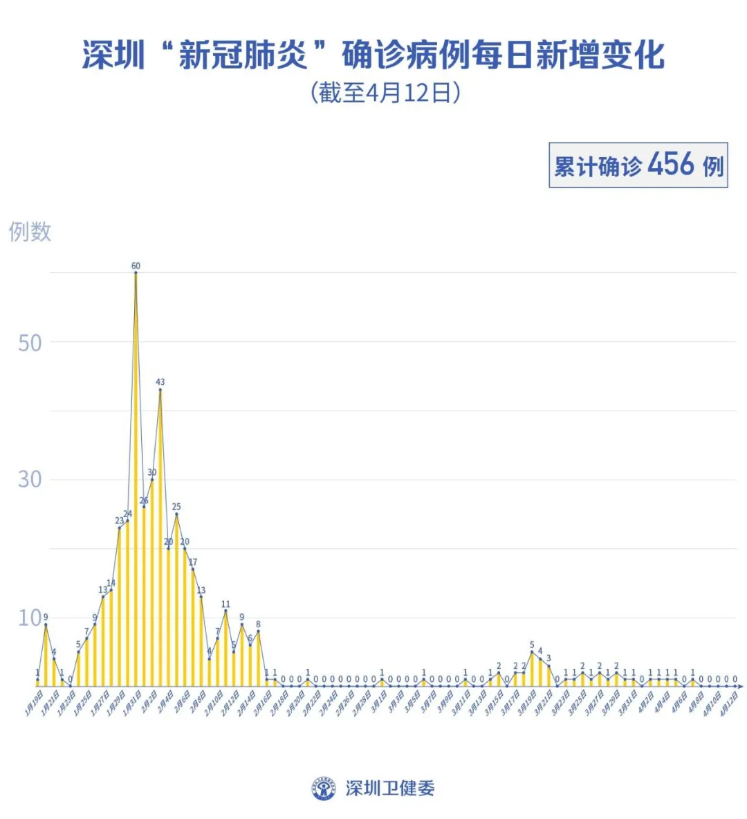 截至4月12日24時,深圳累計報告新冠肺炎病例456例。4月12日當天新增無癥狀感染者1例。