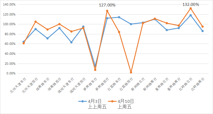 同時(shí),主干道的飽和程度也處于高位。經(jīng)對上周五和上上周五晚高峰各主干道飽和度情況分析,筍崗路西行和紅嶺路北行飽和度最高,超過120%。預(yù)計(jì)本周五各主干道飽和度,依然維持較高狀態(tài)。