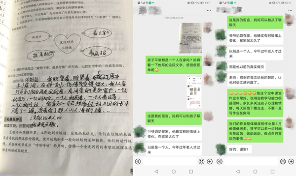 疫情來的迅猛又猝不及防,老師們一方面要完成教學(xué)任務(wù)、引導(dǎo)學(xué)生做好防疫,一方面要時刻關(guān)注學(xué)生的心理健康。學(xué)生們被迫在家度過了一個史上最長的寒假,對于處在叛逆期的孩子們來說,難免會與家人出現(xiàn)一些矛盾,在課堂之外,老師們還需要擔(dān)任“心理調(diào)節(jié)師”的角色。一次,周老師班上有個同學(xué)因為上網(wǎng)課的事情與父母鬧了矛盾,一氣之下跑到奶奶家,周老師得知了這件事情,第一時間聯(lián)系上學(xué)生,通過鼓勵、引導(dǎo),讓學(xué)生認(rèn)識到自己的錯誤,與父母和解。還有一次,周老師通過批改作業(yè),發(fā)現(xiàn)一名學(xué)生在作業(yè)中吐露了自己孤獨、無趣的心聲??吹胶?,周老師立刻與家長溝通了解情況,并建議家長多多陪伴孩子。盡管老師和學(xué)生們不能在學(xué)校的課堂上相聚,但在通訊十分發(fā)達(dá)的現(xiàn)在,老師們也始終用自己的方式陪伴在學(xué)生左右。
