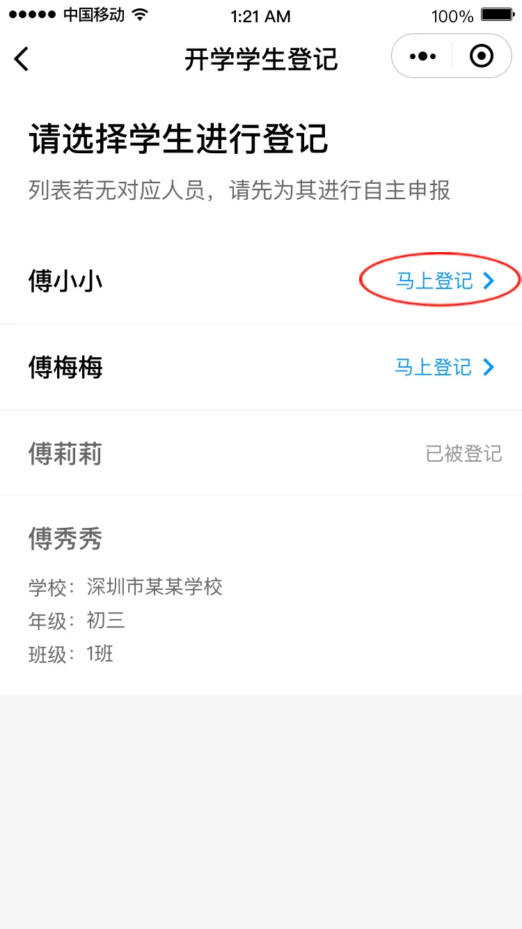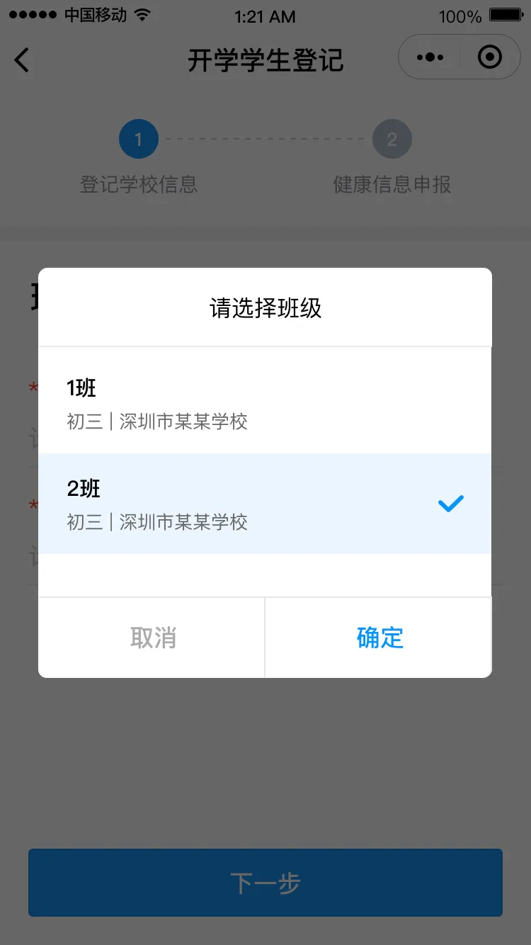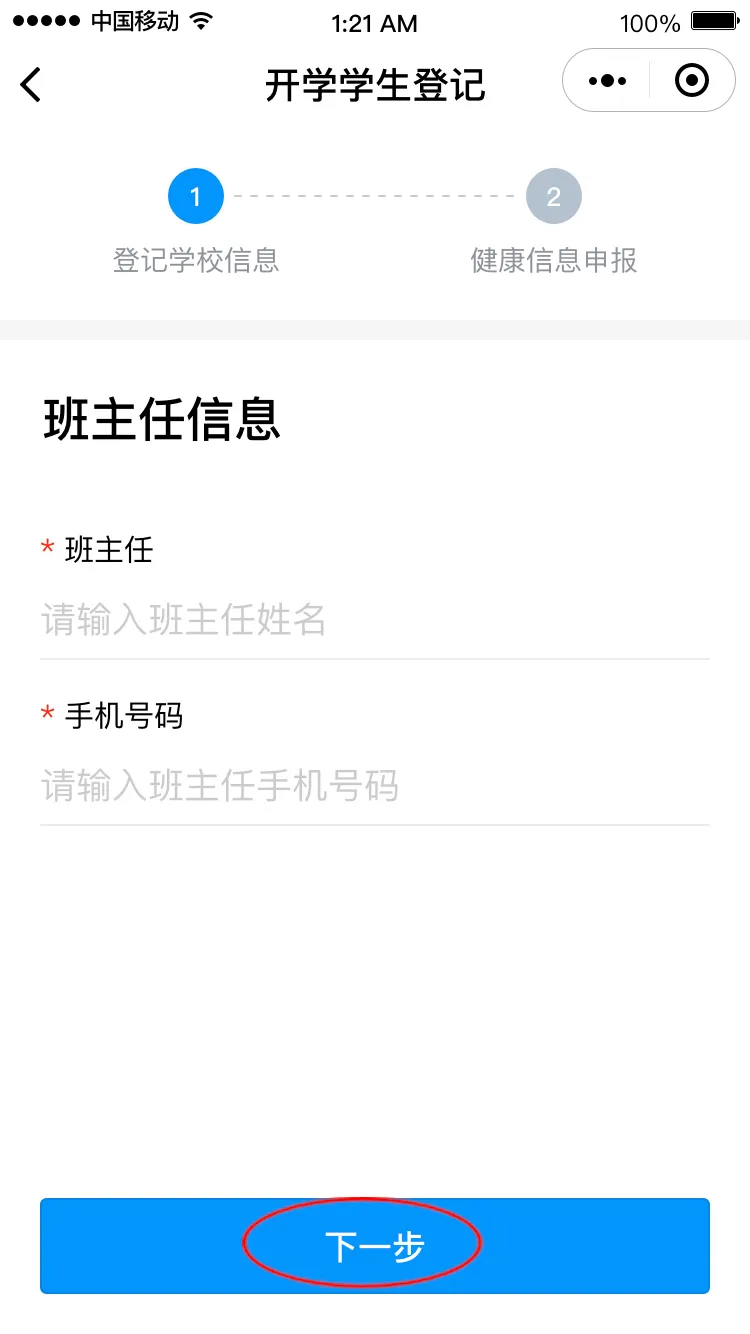 進(jìn)入“開(kāi)學(xué)學(xué)生登記”頁(yè)面,點(diǎn)擊“馬上登記”進(jìn)入登記界面,填寫班主任姓名和手機(jī)號(hào)碼后點(diǎn)擊“下一步”,請(qǐng)選擇對(duì)應(yīng)的班級(jí),進(jìn)入健康申報(bào)卡界面。