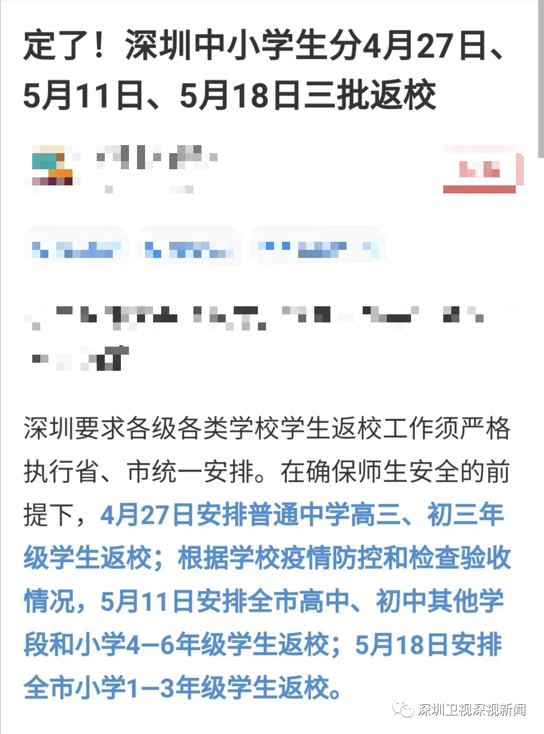 近日,有媒體報道稱,深圳中小學生返校時間已確定。5月11日安排全市高中、初中其他學段和小學4—6年級學生返校;5月18日安排全市小學1—3年級學生返校。