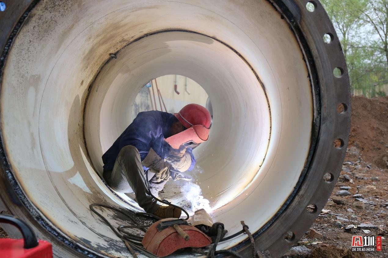 焦作水務(wù)公司電焊工申強(qiáng),正對(duì)府城水廠(chǎng)配套新城加壓站 DN1200管道進(jìn)行工藝焊接。