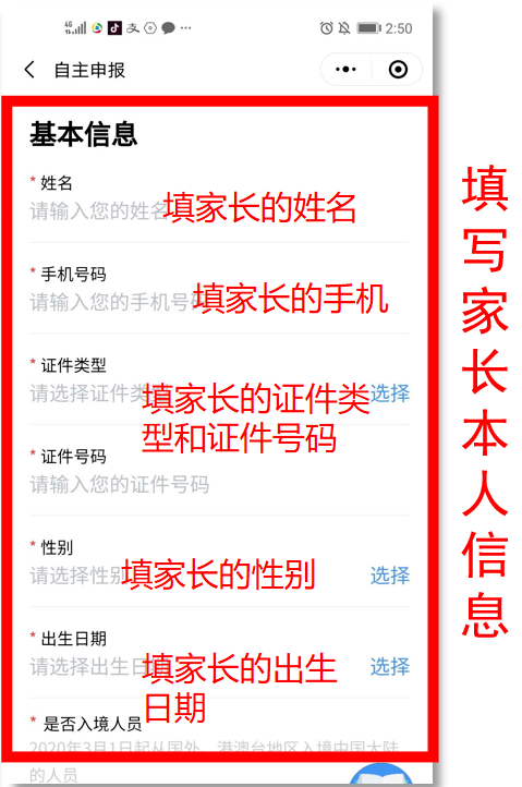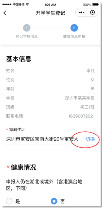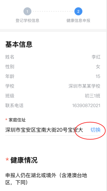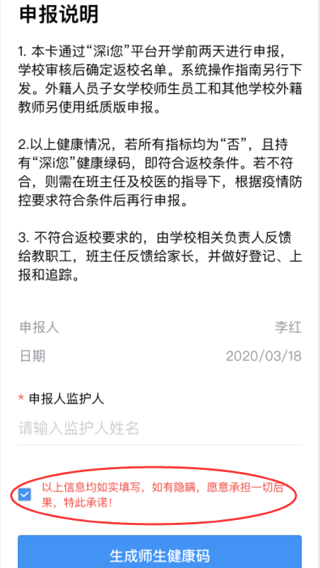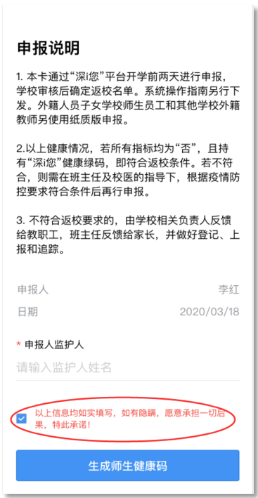 ⑤完成健康信息申報(bào),包括選擇家庭住址、申報(bào)健康情況、填寫監(jiān)護(hù)人姓名等,請(qǐng)勾選申報(bào)承諾,點(diǎn)擊“生成師生健康碼”即可完成健康申報(bào)。