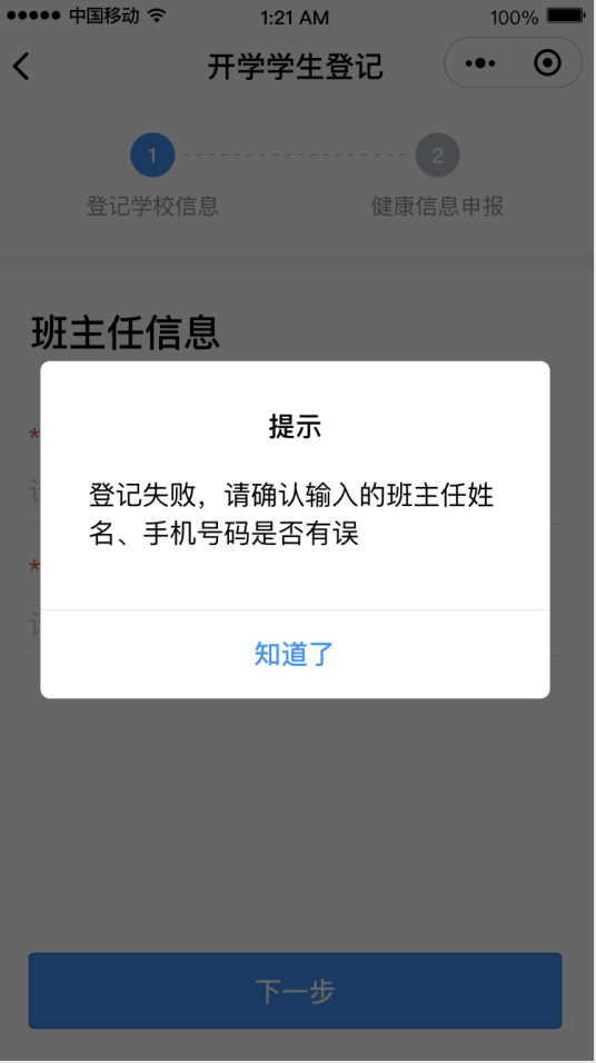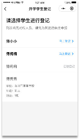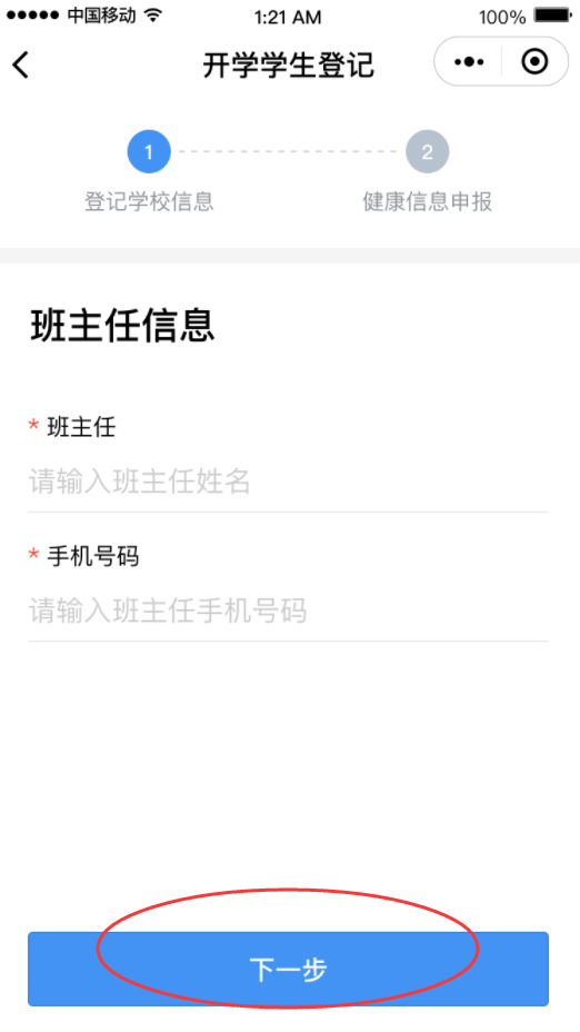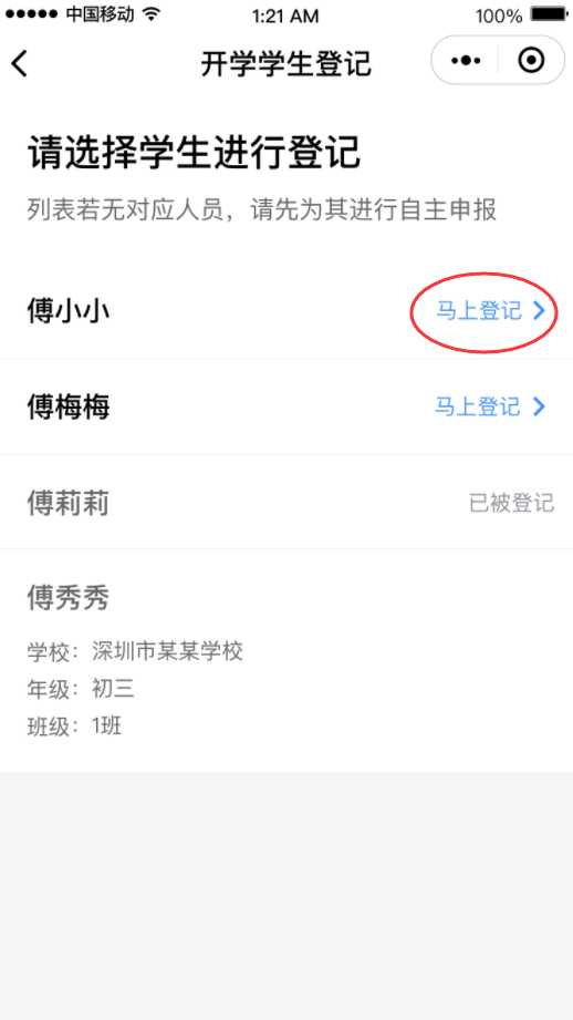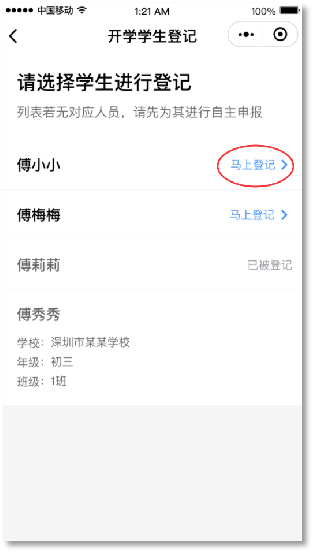 ③完成后進(jìn)入“開學(xué)學(xué)生登記”頁(yè)面,選擇學(xué)生名字旁邊的“馬上登記”,填寫班主任姓名和手機(jī)號(hào)碼后點(diǎn)擊“下一步”。