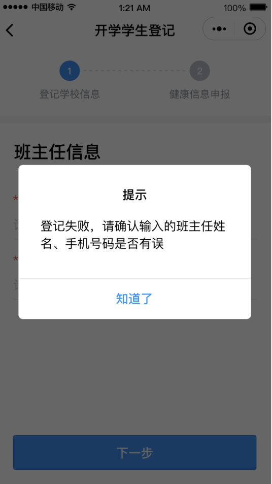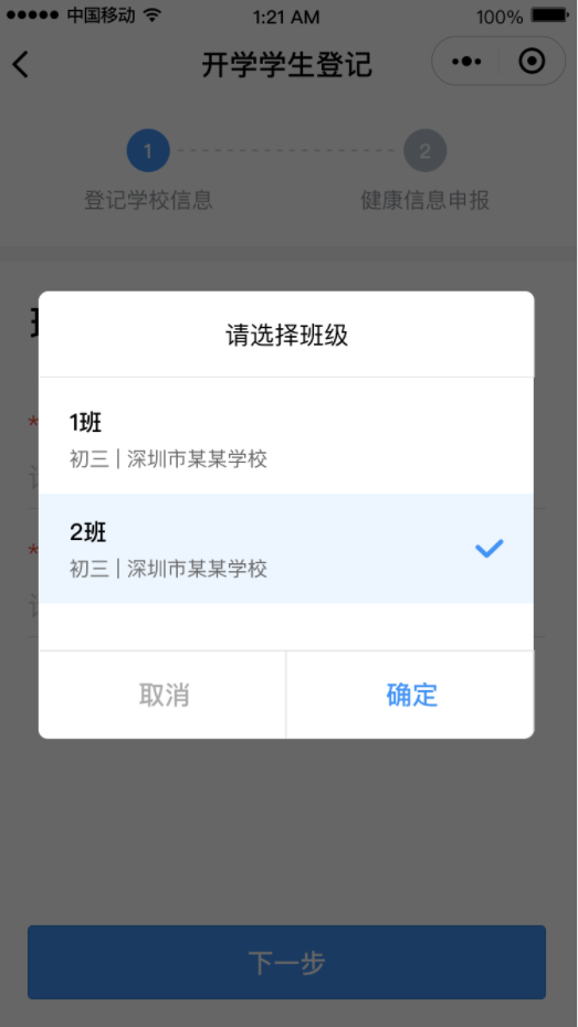 ②進(jìn)入“學(xué)生登記”頁(yè)面,點(diǎn)擊“馬上登記”按鈕,填寫班主任姓名和手機(jī)號(hào)碼后點(diǎn)擊“下一步”,然后選擇對(duì)應(yīng)的班級(jí),進(jìn)入健康申報(bào)卡界面。