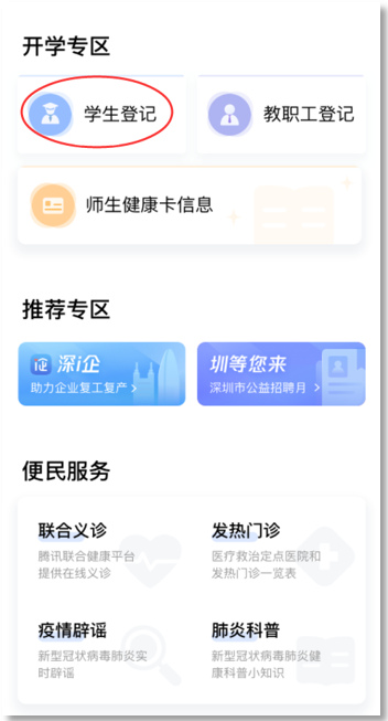 ①在首頁(yè)開學(xué)專區(qū),點(diǎn)擊“學(xué)生登記”進(jìn)入申報(bào)人員列表,進(jìn)行自主申報(bào)和實(shí)名認(rèn)證,再進(jìn)行開學(xué)登記。