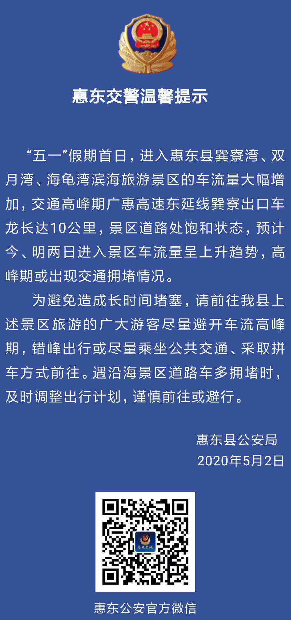 見圳客戶端·深圳新聞網(wǎng)2020年5月2日訊(深圳特區(qū)報記者 陳海峰 通訊員 羅漢波 文/圖)5月2日,惠州市公安局發(fā)布緊急提醒稱,“五一”假期首日,進入廣東省惠州市惠東縣巽寮灣、雙月灣、海龜灣濱海旅游景區(qū)的車流量大幅增加,交通高峰期,廣惠高速東延線巽寮出口車龍長達10公里,景區(qū)道路處飽和狀態(tài)。