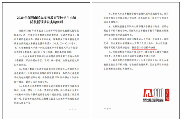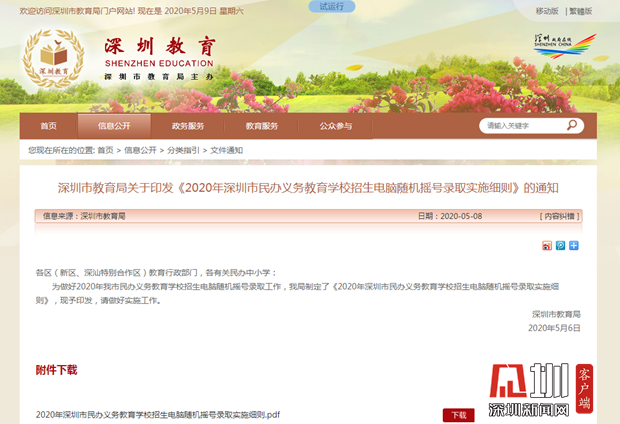圖為深圳市民辦義務(wù)教育學(xué)校招生電腦隨機搖號錄取實施細(xì)則頁面截圖。