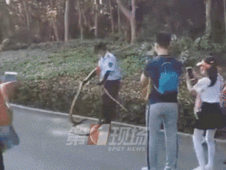最近,兩條體型碩大的蛇突然在蓮花山公園人行道旁邊的草叢出沒(méi),隨后,一名公園內(nèi)的保安人員徒手捕捉了兩條蛇。