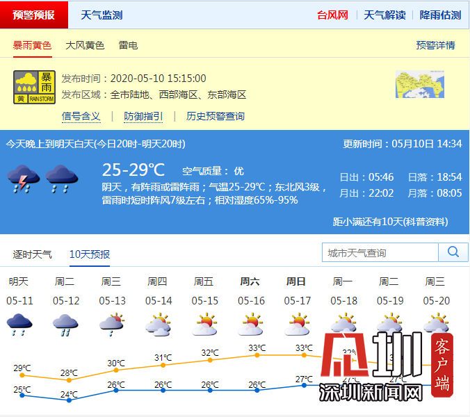 全市進入暴雨戒備狀態(tài),請注意防御大風(fēng)和短時強降水及其引發(fā)的城市積澇、隧道涵洞匯流等。此前,深圳市氣象臺于2020年05月10日15時00分在全市發(fā)布雷電預(yù)警,預(yù)計60分鐘內(nèi)全市自西北向東南將受雷電影響。