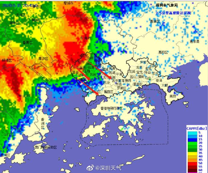 20時(shí)56分:目前強(qiáng)雷雨云團(tuán)已開始影響寶安北部,未來一小時(shí)強(qiáng)雷雨自西向東影響寶安、光明、龍華、南山、福田、羅湖區(qū),上述區(qū)域最大小時(shí)雨量30-40毫米,請(qǐng)大家注意做好防御。