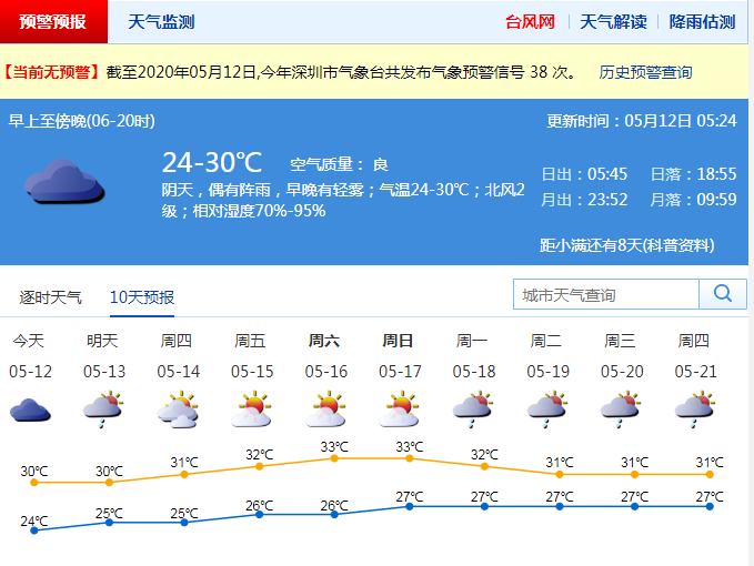 見圳客戶端·深圳新聞網(wǎng)2020年5月12日訊 深圳昨夜雷電+大風黃色+暴雨黃色預警齊生效,市氣象臺于2020年05月11日23時30分在全市取消暴雨黃色、大風黃色預警。預計12日白天多云間陰天,有陣雨。13日陣雨轉多云,天況逐漸轉好,14-17日多云為主,陽光充足,天氣再趨炎熱。