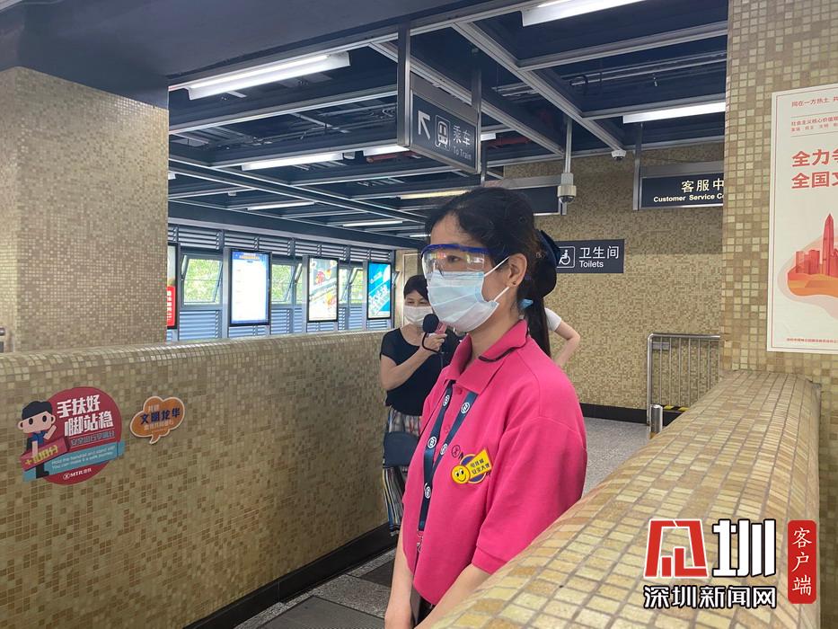 地鐵站內,一位工作人員整齊佩戴口罩與護目鏡,引導市民有序搭乘地鐵。