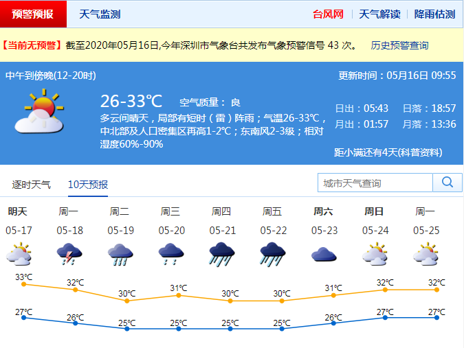 見圳客戶端·深圳新聞網2020年5月16日訊 深圳市氣象臺預報,周末天氣悶熱局部有短時(雷)陣雨下周轉趨多降雨天氣:周末期間(16-17日)多云間晴天,天氣悶熱,局部地區(qū)有短時(雷)陣雨,氣溫27-33℃,中北部最高氣溫可達35℃左右;下周轉趨多降雨天氣,其中18-19日有中到大雨局部暴雨,伴有短時強降雨、短時大風。