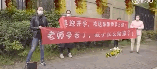 喜上眉梢的家長們甚至站在校門口拉起橫幅:喜迎開學,歡送上課!