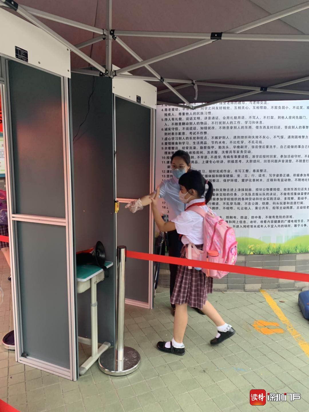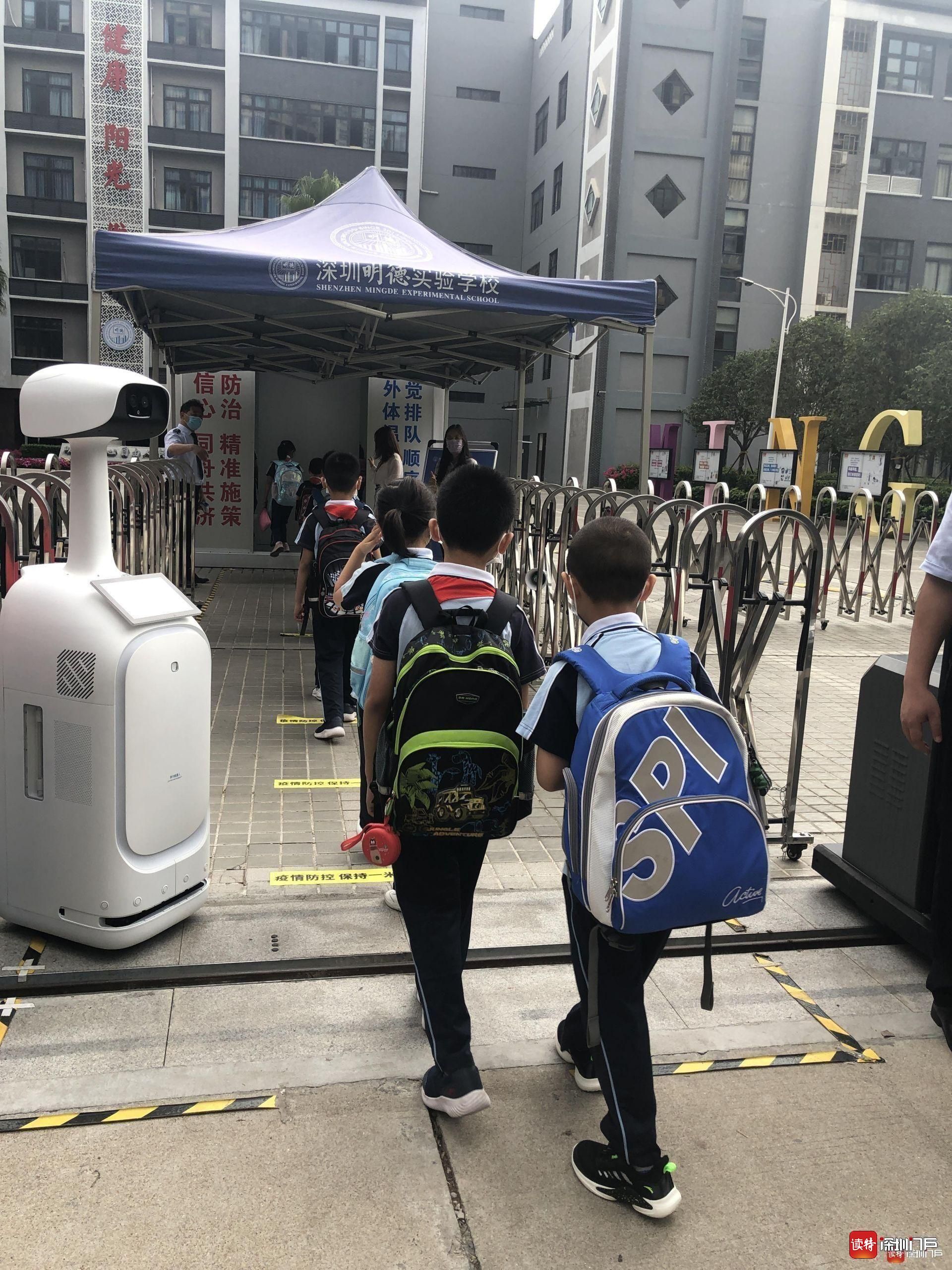 “同學們好!”“歡迎回來!”從7點起,明德實驗學校校長魯江與工作人員就在香蜜校區(qū)校門口迎候?qū)W生們,提醒孩子們戴好口罩,也與家長們交流返校事宜。校門口的一臺超氧水消殺機器人也在積極投入工作,工作人員在后臺控制面板可以監(jiān)測到入校人員的體溫情況。