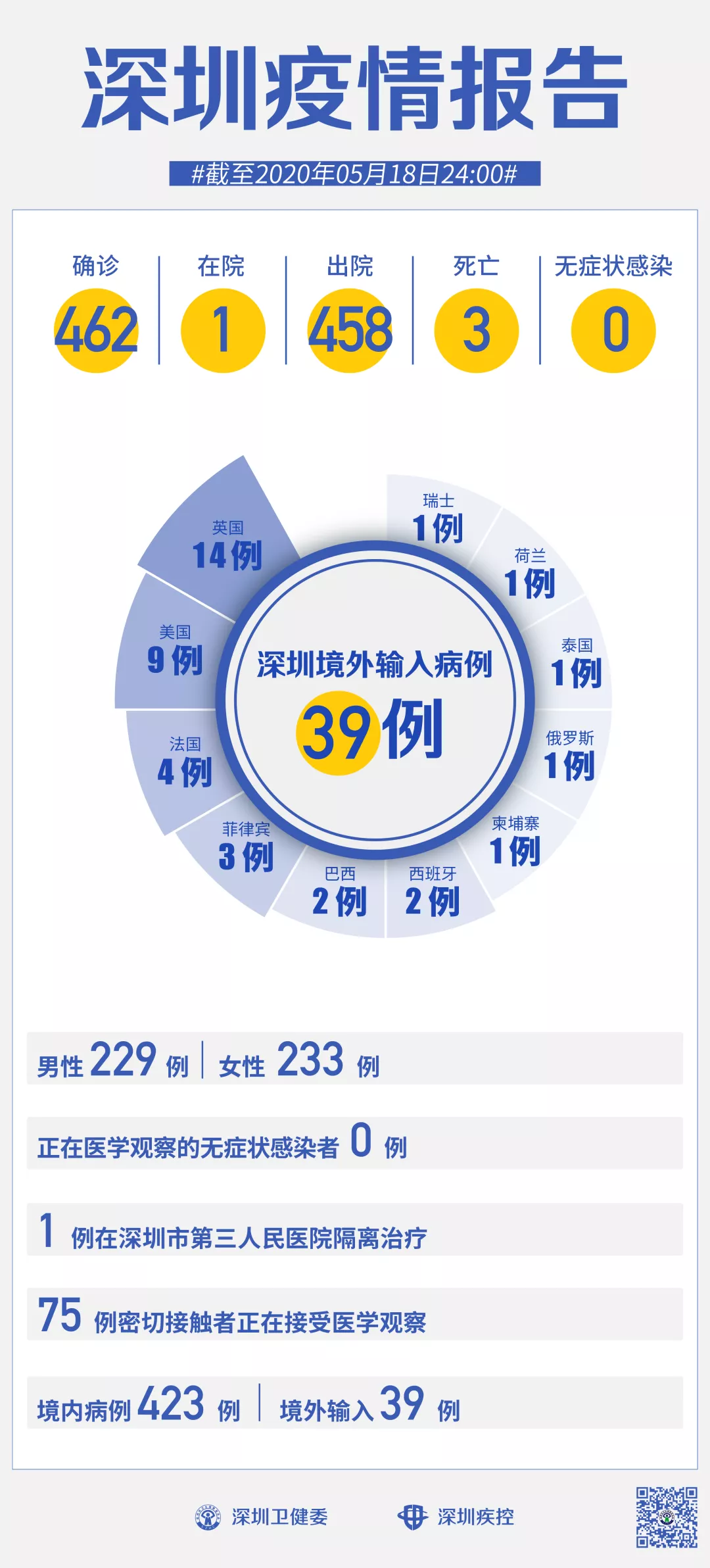 截至5月18日24時,深圳累計報告新冠肺炎病例462例。