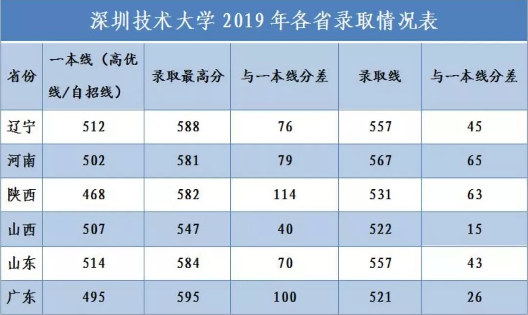 2019年,深圳技術大學首次獨立招生,面向遼寧、河南、陜西、山西、山東和廣東六省,共錄取807名新生。六省份均一次性滿額投檔,高于一本線(高優(yōu)線/自招線)錄取。其中河南、陜西高于一本線60分,遼寧、山東高于一本線40分。廣東錄取分數(shù)線為521分,高于理科優(yōu)先投檔分數(shù)線26分,列廣東高校理科第九,錄取最高分為595分。