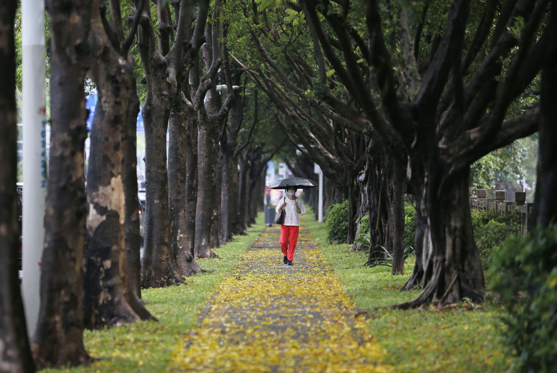 2020年5月26日中午13:46分,商報(bào)東二路附近,短時(shí)強(qiáng)降水加上刮風(fēng),路面上都是樹葉,一位市民經(jīng)過。
