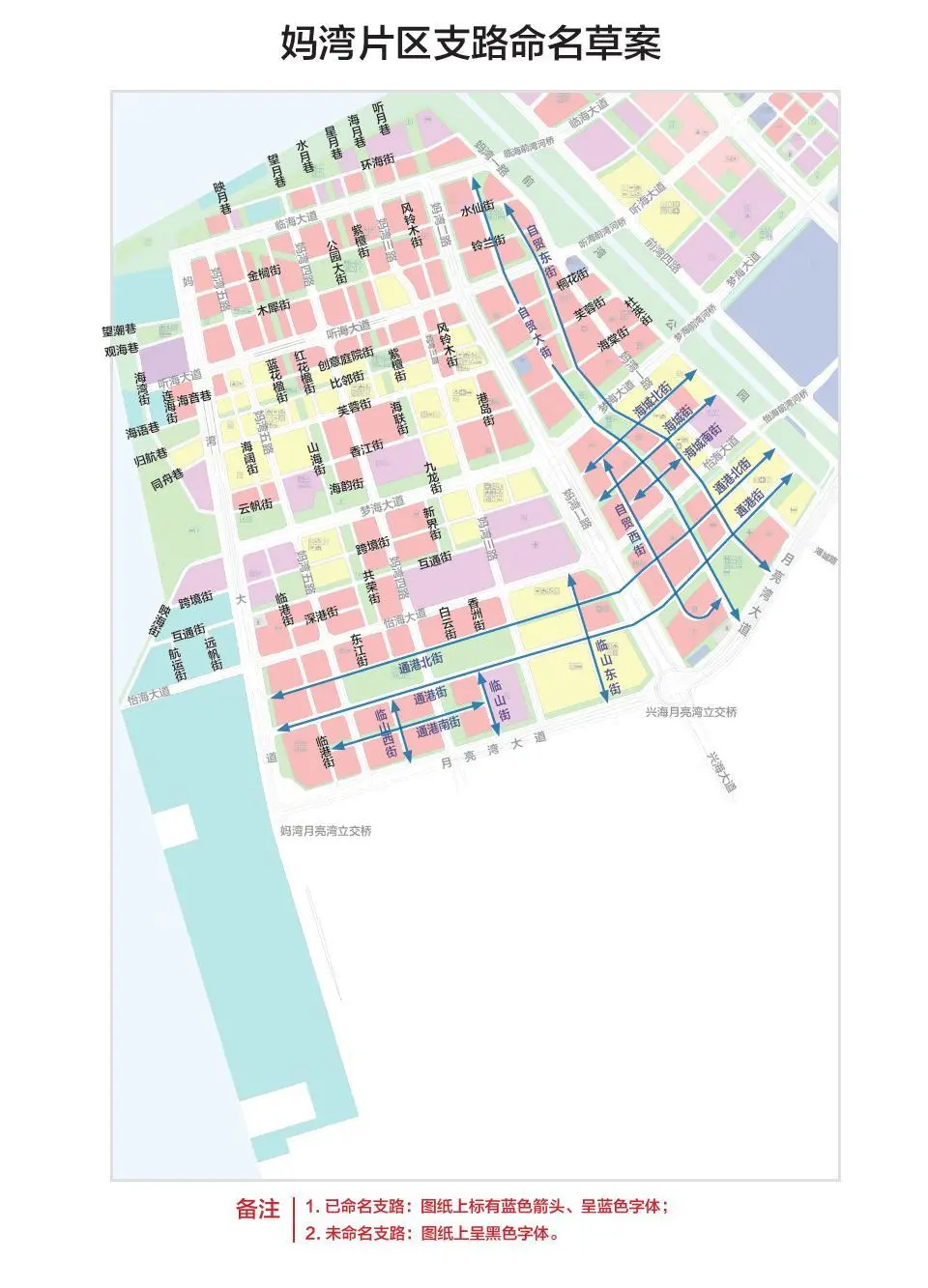 本次命名草案按照相關(guān)法規(guī)文件,結(jié)合前海桂灣、前灣、媽灣各片區(qū)的規(guī)劃定位、功能布局以及建設(shè)情況,針對(duì)三大片區(qū)和重要功能區(qū)功能、項(xiàng)目布局等特征,對(duì)前海15平方公里支路進(jìn)行了全覆蓋命名。