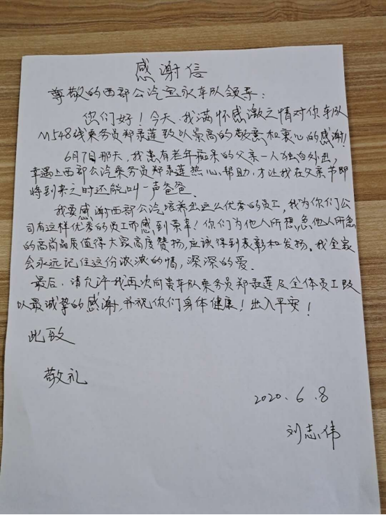 見(jiàn)圳客戶端·深圳新聞網(wǎng)2020年6月9日訊(深圳特區(qū)報(bào)記者 徐興東)6月9日早上,一位自稱劉先生的年輕人冒著滂沱大雨來(lái)到了西部公汽寶永車隊(duì)。一進(jìn)辦公室,劉先生雙手捧著將親筆寫(xiě)的一封感謝信呈給了隊(duì)助張喜鳳,并深有感觸地說(shuō)道:“多災(zāi)多難的父親有幸遇到乘務(wù)員鄭錄蓮的熱心幫助,并想方設(shè)法聯(lián)系上我。謝謝你們的成全,才讓我在父親節(jié)即將到來(lái)之時(shí)還能叫一聲爸爸,我將終生銘記諸位的大恩大德!”樸實(shí)無(wú)華的話語(yǔ),感染了在場(chǎng)的每一個(gè)人,分明看出個(gè)個(gè)眼里都閃爍著晶瑩的喜悅淚花。
