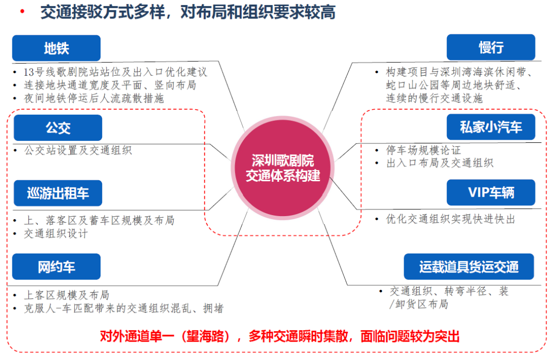 肯定了目前交通組織的總體方案,提出需充分利用地面望海路的交通疏散功能,考慮歌劇院作為地標(biāo)景點(diǎn)的吸引力,適當(dāng)增加停車位的彈性及可達(dá)性。同時(shí)建議市交通運(yùn)輸局需結(jié)合深圳歌劇院的建設(shè)重新對望海路地下快速路的規(guī)劃方案開展研究工作。