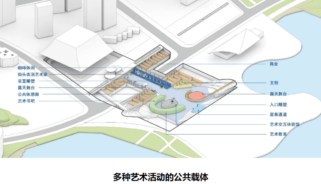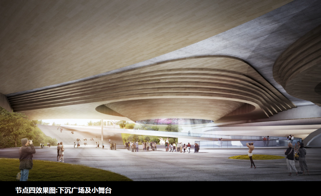 南側(cè)主體建筑之下的藝術(shù)開放大廳,連續(xù)的吊頂在這里變化、發(fā)散又聚合,自然圍合出具有先鋒藝術(shù)水準(zhǔn)的表演舞臺和藝術(shù)體驗(yàn)館區(qū)域。