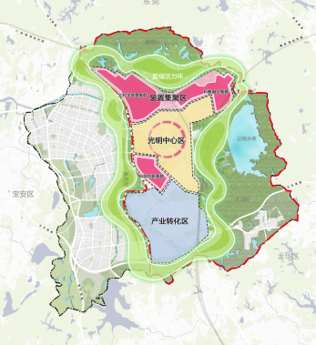 北部裝置集聚區(qū),營造嵌山擁湖、綠蔭環(huán)繞的“科學(xué)山林”總體風(fēng)貌。中部光明中心區(qū),形成中央公園與垂直城市錯(cuò)落有致的“樂活城區(qū)”風(fēng)貌。南部產(chǎn)業(yè)轉(zhuǎn)化區(qū),塑造富有生態(tài)內(nèi)涵和科技文化氛圍的“共享智谷”風(fēng)貌。
