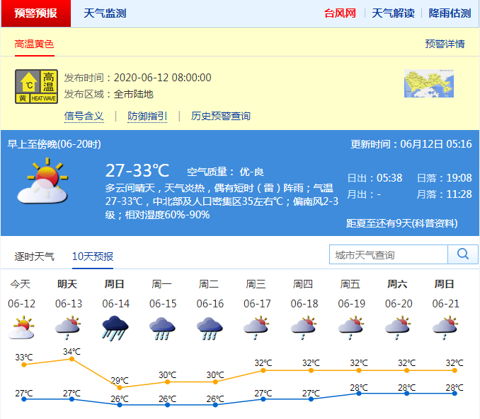 見(jiàn)圳客戶端·深圳新聞網(wǎng)2020年06月12日訊 深圳市氣象臺(tái)于2020年06月12日08時(shí)00分在全市陸地發(fā)布高溫黃色預(yù)警,預(yù)計(jì)12-13日深圳市最高氣溫將升至35℃以上,信號(hào)可能持續(xù)2天,做好防暑降溫工作,避免長(zhǎng)時(shí)間戶外或者高溫條件下的作業(yè)。