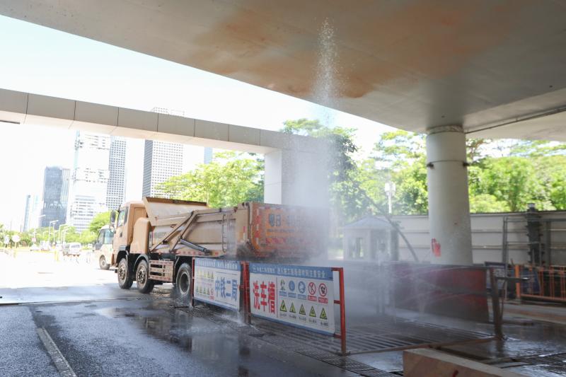 相信很多市民朋友對自卸車(俗稱“泥頭車”)的印象就是又吵又臟,對此記者在現場看到,福田區(qū)的工地已經用上電動自卸車,跟燒柴油的自卸車相比,不僅節(jié)能環(huán)保,且車子運行的噪音也非常小。不僅如此,為了防止自卸車“帶泥上路”,工地的出口處還設有車輛自動沖洗系統(tǒng),每輛泥頭車在駛出工地之前,都要經歷一次“全身淋浴”,徹底沖干凈車身以及輪胎上的泥土之后才能離開。