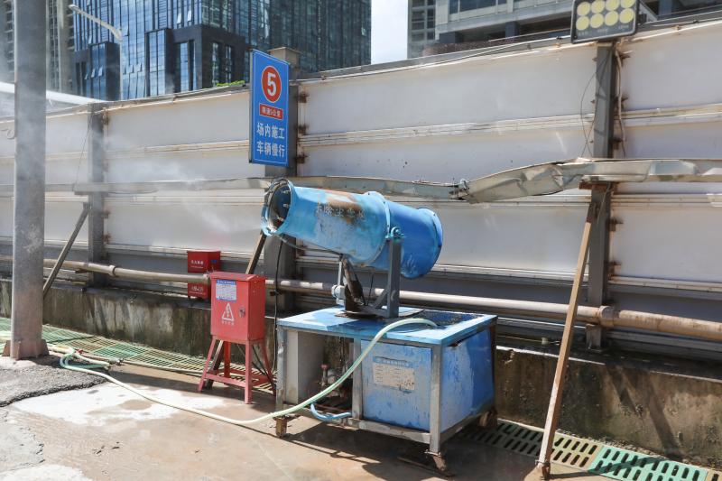 記者看到,整個工地都已設置了封閉的圍擋,且圍擋墻上都裝有自動感應噴淋系統(tǒng),整個系統(tǒng)由智能控制器控制,在車輛經過感應到有揚塵產生后就會自動噴出水霧,在圍擋墻的上方形成一道“水霧屏障”,有效地為施工場地降塵,當水箱中水位不足時還會自動補充水源。
