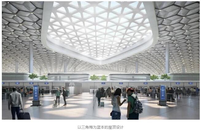 地面公園、主入口廣場(chǎng)以及綠化屋頂以開放、友好的姿態(tài)展現(xiàn)生態(tài)環(huán)保表達(dá)建筑的公共屬性。主入口處外立面向上,展露出內(nèi)部的玻璃幕墻,以開放的姿態(tài)迎接旅客的到來。引入“垂直疊放”設(shè)計(jì)策略,高效組織口岸出入境及公共交通換乘,整合聯(lián)系城市綠軸與福田口岸無縫連接,致力在區(qū)域核心打造一個(gè)開放、綠色與城市緊密聯(lián)系的公共空間。
