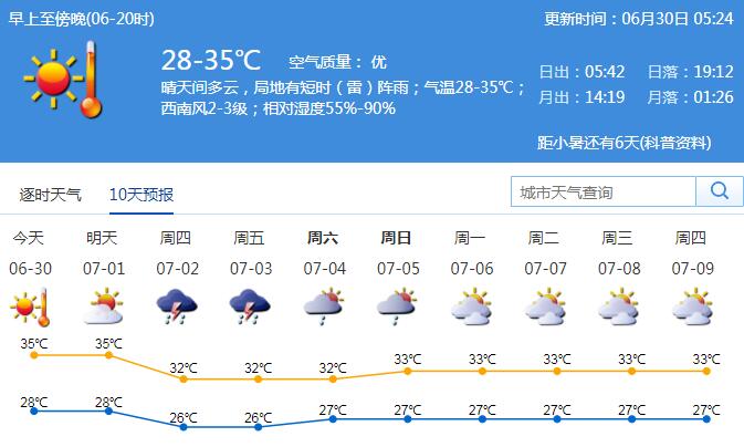 見圳客戶端·深圳新聞網(wǎng)2020年6月30日訊 我市今天晴天間多云,局地有短時(shí)(雷)陣雨;氣溫28-35℃;西南風(fēng)2-3級;相對濕度55%-90%。