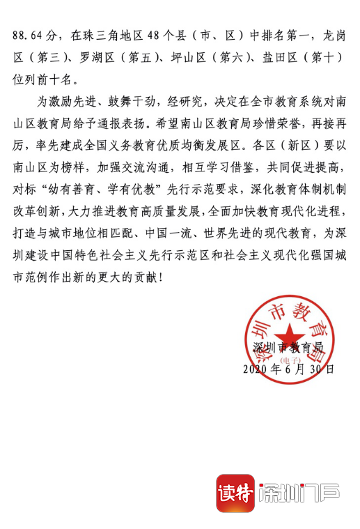 見(jiàn)圳客戶端·深圳新聞網(wǎng)2020年7月1日訊(深圳特區(qū)報(bào)記者 李麗)6月30日,《深圳市教育局關(guān)于表?yè)P(yáng)南山區(qū)教育局的通報(bào)》在全市教育界引起關(guān)注。通報(bào)表示,近日,廣東省人民政府教育督導(dǎo)室印發(fā)深圳市2018年度履行教育職責(zé)評(píng)價(jià)意見(jiàn),深圳2018年度履行教育職責(zé)評(píng)價(jià)成績(jī)?yōu)?8.20分,在珠三角地區(qū)9個(gè)地級(jí)市中排名第一,其中,南山區(qū)成績(jī)?yōu)?8.64分,在珠三角地區(qū)48個(gè)縣(市、區(qū))中排名第一。經(jīng)研究,決定在全市教育系統(tǒng)對(duì)南山區(qū)教育局給予通報(bào)表?yè)P(yáng),并希望南山區(qū)教育局率先建成全國(guó)義務(wù)教育優(yōu)質(zhì)均衡發(fā)展區(qū)。
