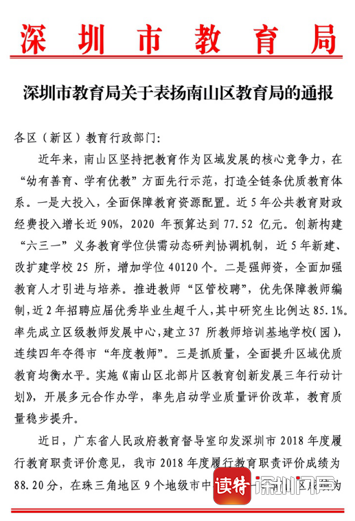 深圳市教育局通報(bào)表?yè)P(yáng):南山教育履職評(píng)價(jià)成績(jī)位列珠三角第一名!