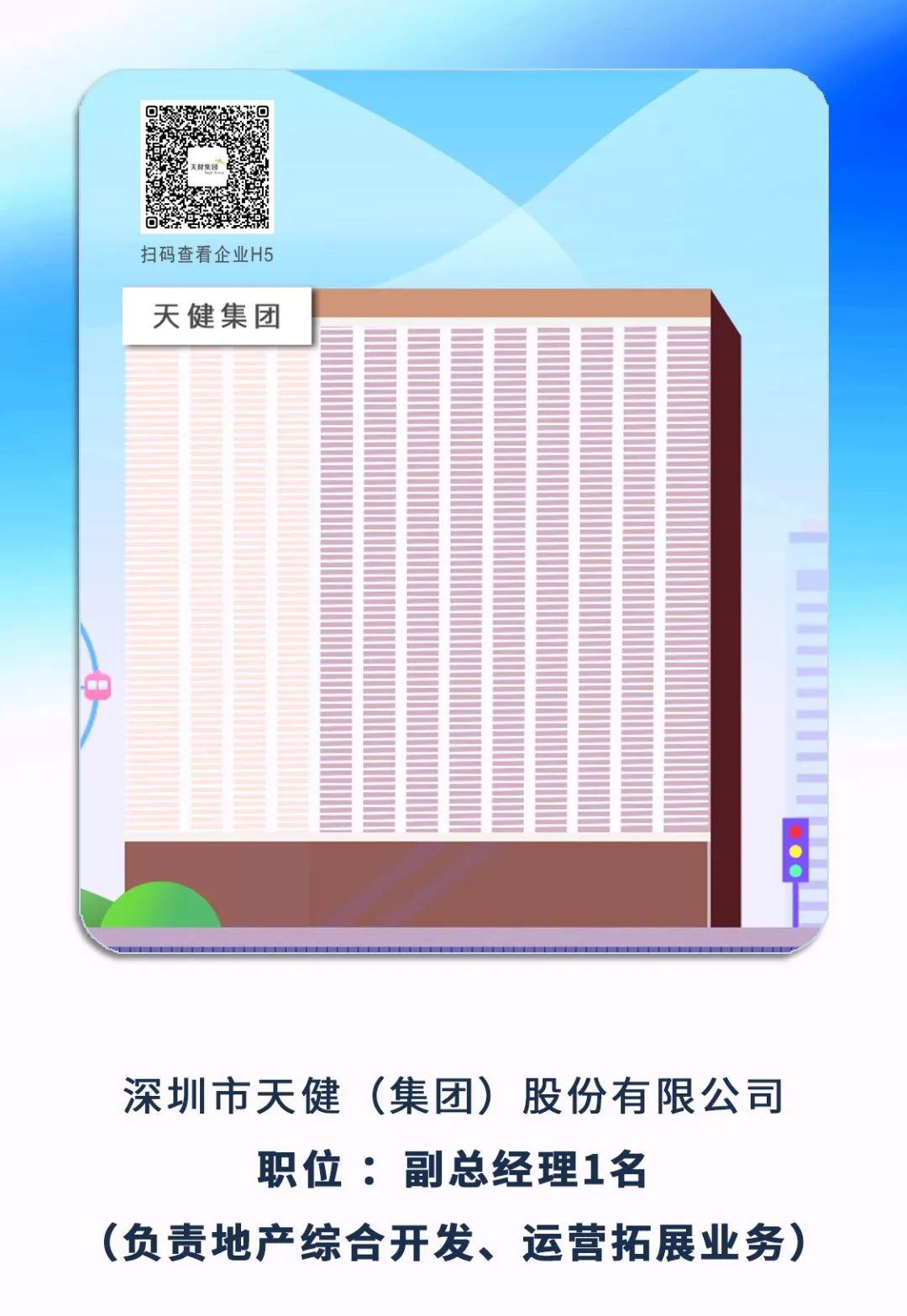 6、深圳市天?。瘓F(tuán))股份有限公司副總經(jīng)理1名(負(fù)責(zé)地產(chǎn)綜合開發(fā)、運(yùn)營拓展業(yè)務(wù))