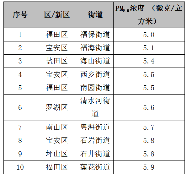 今年6月,全市74個(gè)街道PM2.5濃度在5.0-10.2微克/立方米之間,均值為7.0微克/立方米。排名前十的是:福保、福海、海山、西鄉(xiāng)、南園、清水河、粵海、石巖、石井和蓮花等街道,排名倒數(shù)前十的是:觀瀾、坪地、龍?zhí)铩⒋罄?、馬田、公明、龍崗、龍華、沙井和鳳凰等街道。
