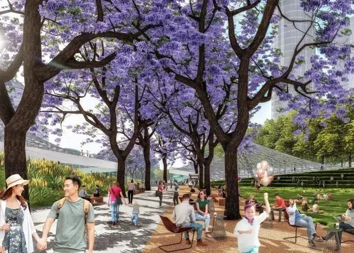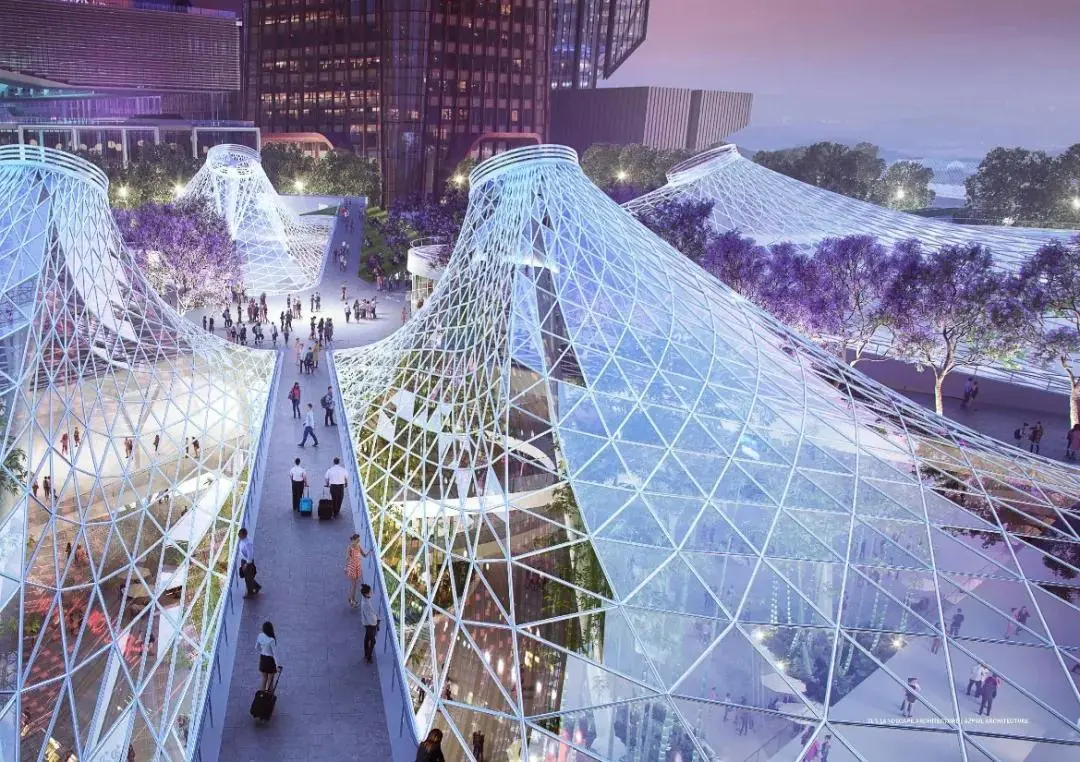 為車站廣場,“水晶山丘”屋面覆蓋著地下車站樞紐大廳,同時也在地面創(chuàng)造出造型獨特的城市地標(biāo)。光影和夜景效果與交叉的藍(lán)花楹大道配合,打造一個極具設(shè)計感的交通集散空間。地下共享大廳、地下森林與地面廣場、周邊建筑建立視覺聯(lián)系,成為中央綠軸美景的一部分。