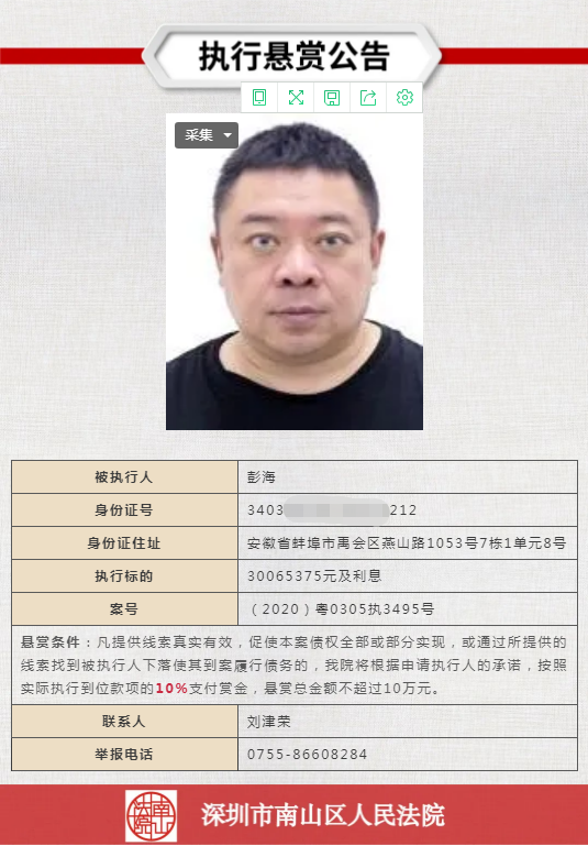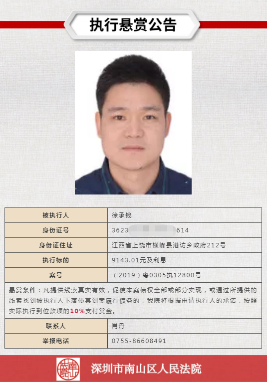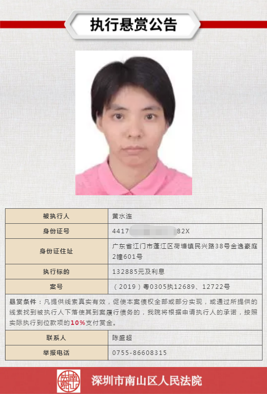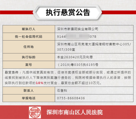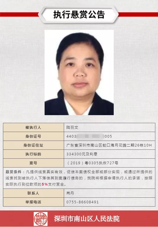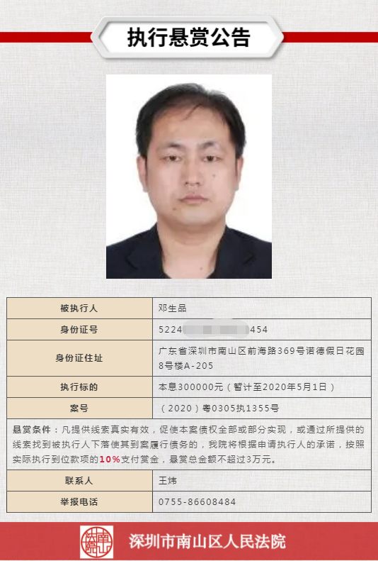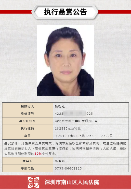 經(jīng)申請執(zhí)行人申請,深圳市南山區(qū)人民法院向社會發(fā)布懸賞舉報公告,凡提供線索真實有效,促使本案債權(quán)全部或部分實現(xiàn),或通過所提供的線索找到被執(zhí)行人下落使其到案履行債務(wù)的,深圳市南山區(qū)人民法院將根據(jù)申請執(zhí)行人的承諾,按照實際執(zhí)行到位款項給予一定金額的賞金。