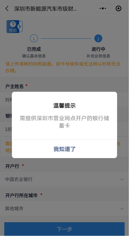客戶需上傳銀行卡照片,并填寫銀行賬號、開戶行信息。開戶行如不在選項范圍內(nèi)可選擇“其他”自填。其中,銀行賬號需為深圳市營業(yè)網(wǎng)點開戶的銀行一類儲蓄卡,華僑、港澳臺地區(qū)居民及外國人需提供深圳市建設(shè)銀行一類儲蓄卡。