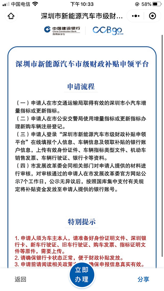 客戶進(jìn)入平臺后,可查詢平臺申請流程、注意事項。點擊“立即辦理”后,可進(jìn)一步在線閱讀《深圳市應(yīng)對新冠肺炎疫情影響促進(jìn)新能源汽車推廣應(yīng)用若干措施》、《深圳市應(yīng)對新冠肺炎疫情影響促進(jìn)新能源汽車推廣應(yīng)用若干措施財政補(bǔ)貼申領(lǐng)工作指引》等政府相關(guān)政策文件。