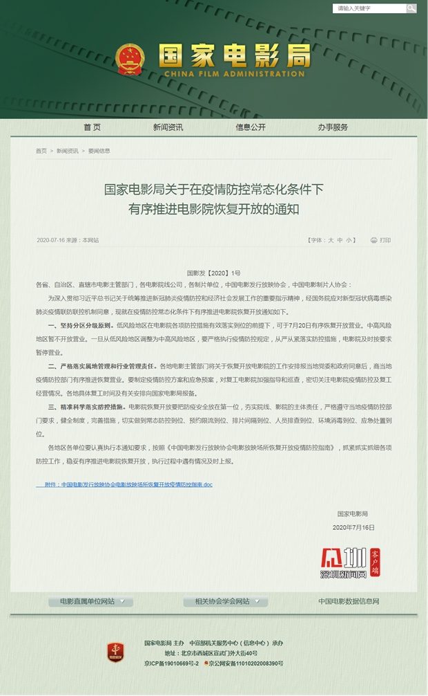 見圳客戶端·深圳新聞網(wǎng)2020年7月16日訊(見圳客戶端、深圳新聞網(wǎng)記者 張玲)好消息,低風(fēng)險(xiǎn)地區(qū)電影院可在7月20日恢復(fù)開放。7月16日,國家電影局官網(wǎng)發(fā)布《國家電影局關(guān)于在疫情防控常態(tài)化條件下有序推進(jìn)電影院恢復(fù)開放的通知》,通知要求低風(fēng)險(xiǎn)地區(qū)電影院預(yù)約限流、排片間隔、人員排查以及環(huán)境消毒、應(yīng)急處置等工作都要到位。