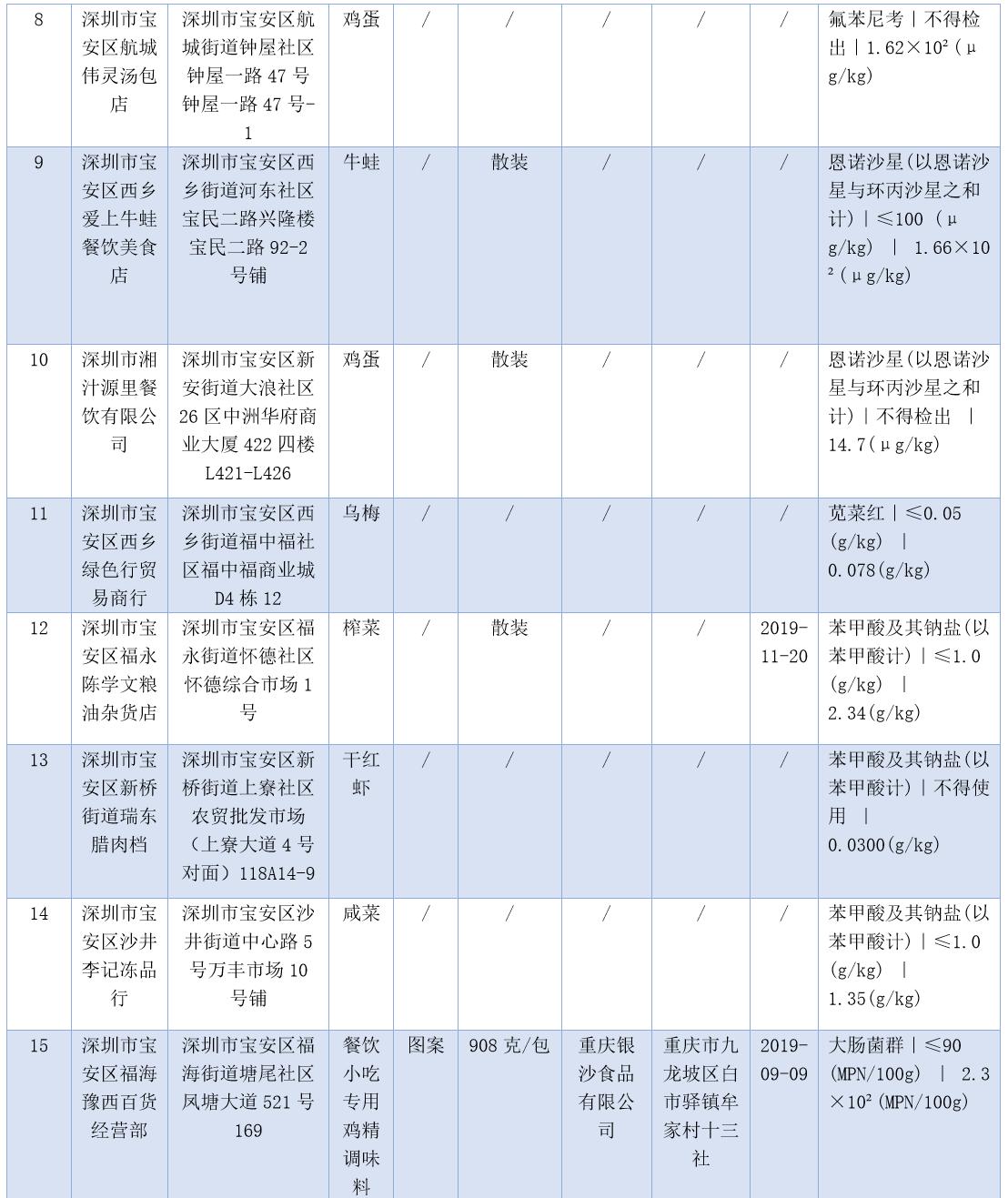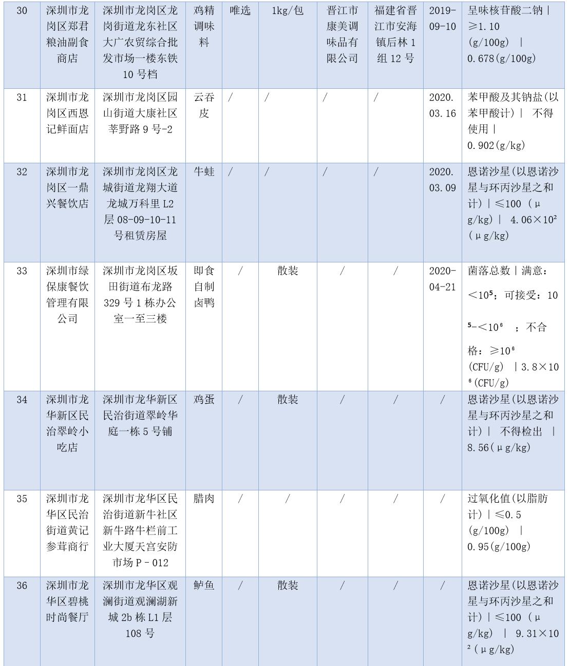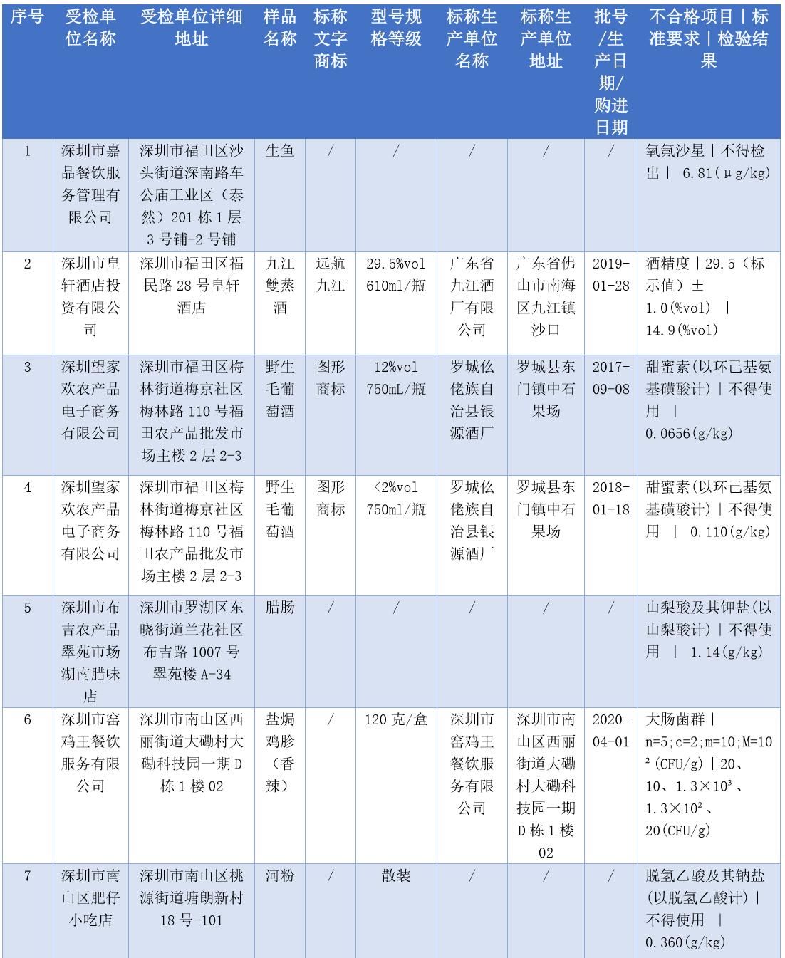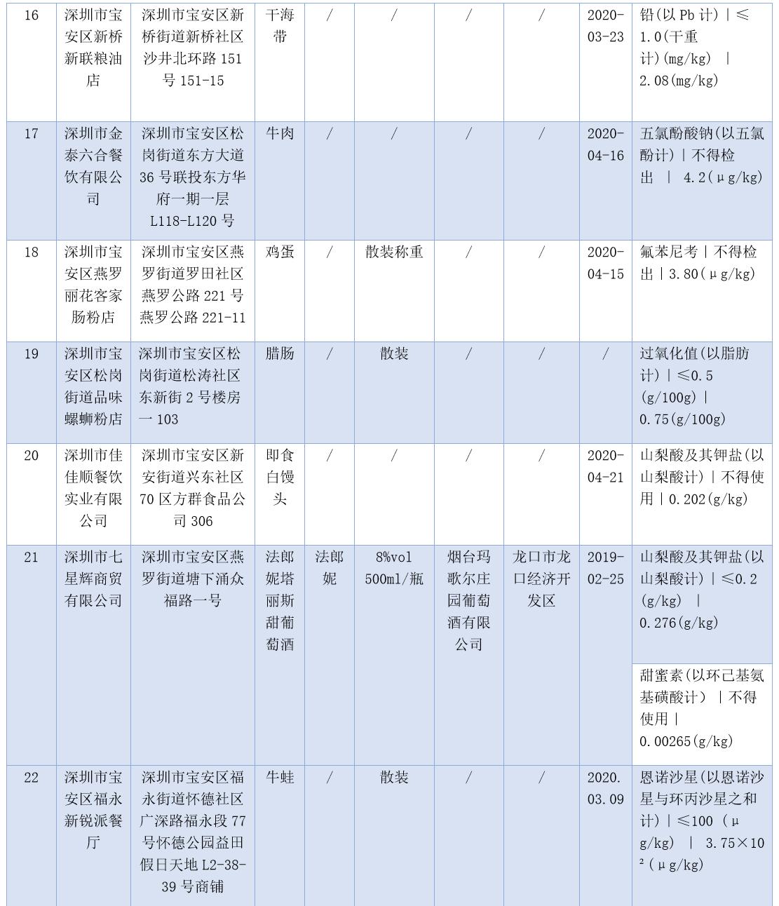 見圳客戶端·深圳新聞網(wǎng)2020年7月17日訊(晶報記者 鄧裴裴/制圖)7月17日,深圳市市場監(jiān)督管理局官網(wǎng)發(fā)布了2020年第二十二期食品安全抽樣檢驗情況通報,3-5月,共抽檢生產(chǎn)、流通、餐飲環(huán)節(jié)食品1229批次,發(fā)現(xiàn)不合格樣品47批次。記者注意到,不少不合格樣品抽檢單位為餐飲店,包括皇軒酒店、窯雞王、愛上牛蛙、御可奶茶等,還有些小吃店、腸粉店、螺獅粉店紛紛上榜。涉及不合格項目類別包括農(nóng)藥殘留、獸藥殘留、食品添加劑、微生物污染、品質(zhì)指標(biāo)、金屬等元素污染物。