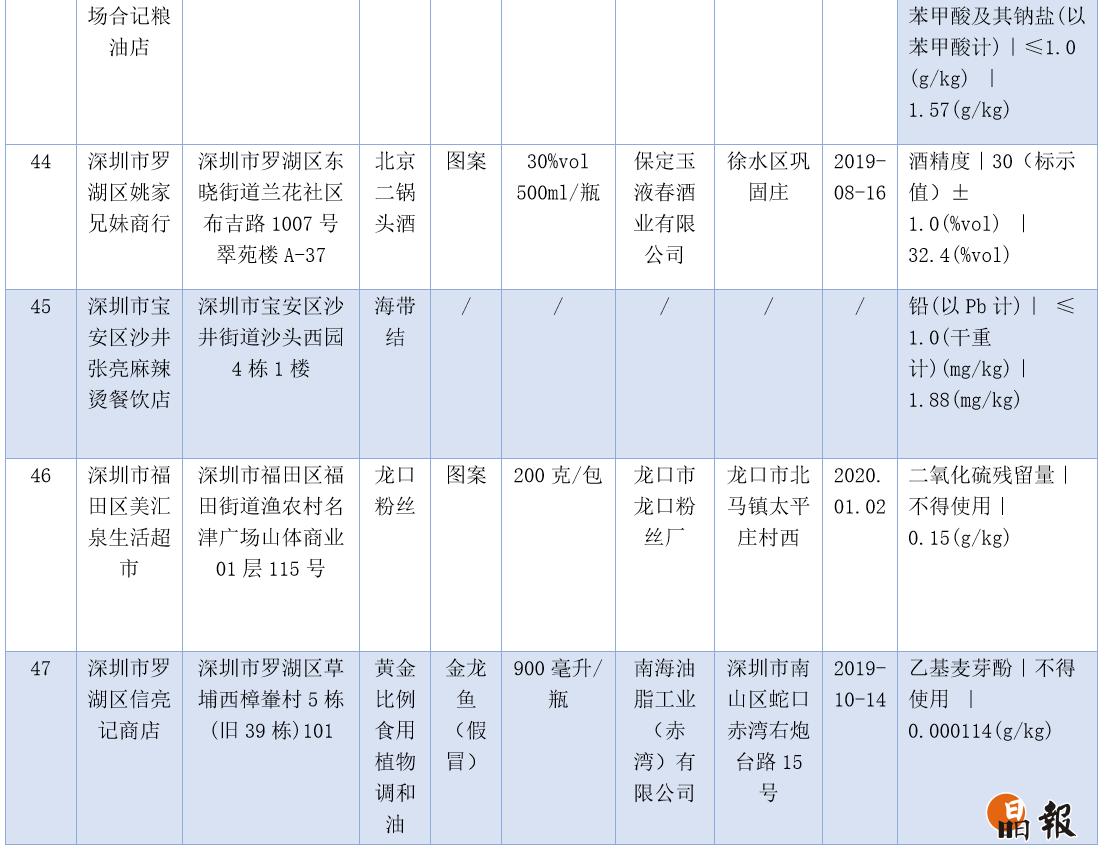 本次不合格樣品涉及的食物種類較多,臘腸、雞蛋、榨菜、酒等都檢出問題,值得注意的是,羅湖區(qū)草埔西樟輋村信亮記商店出售假冒的金龍魚油,檢出了不得使用的乙基麥芽酚,其標(biāo)稱生產(chǎn)企業(yè)為南山區(qū)南海油脂工業(yè)(赤灣)有限公司,后經(jīng)核實,不合格產(chǎn)品非該公司生產(chǎn)。
