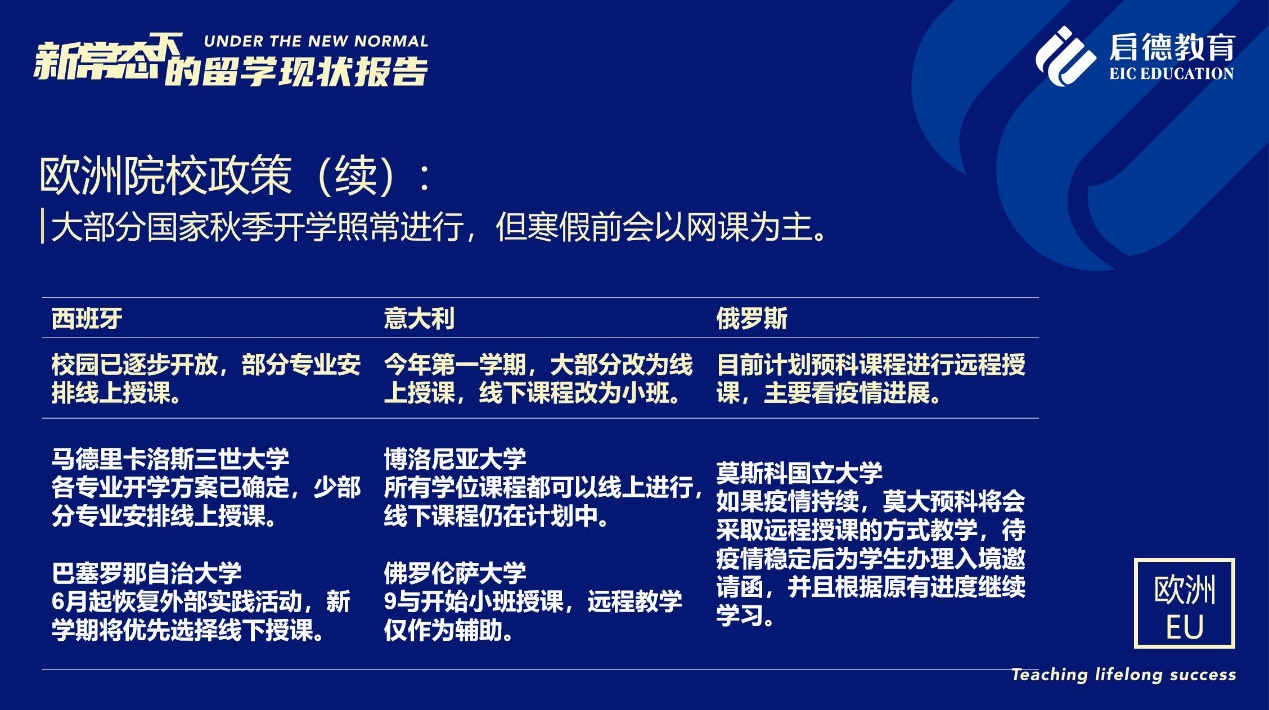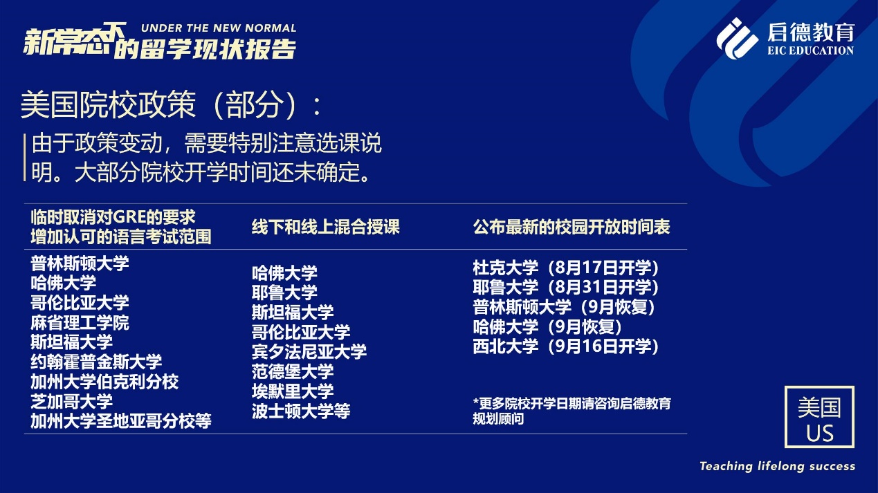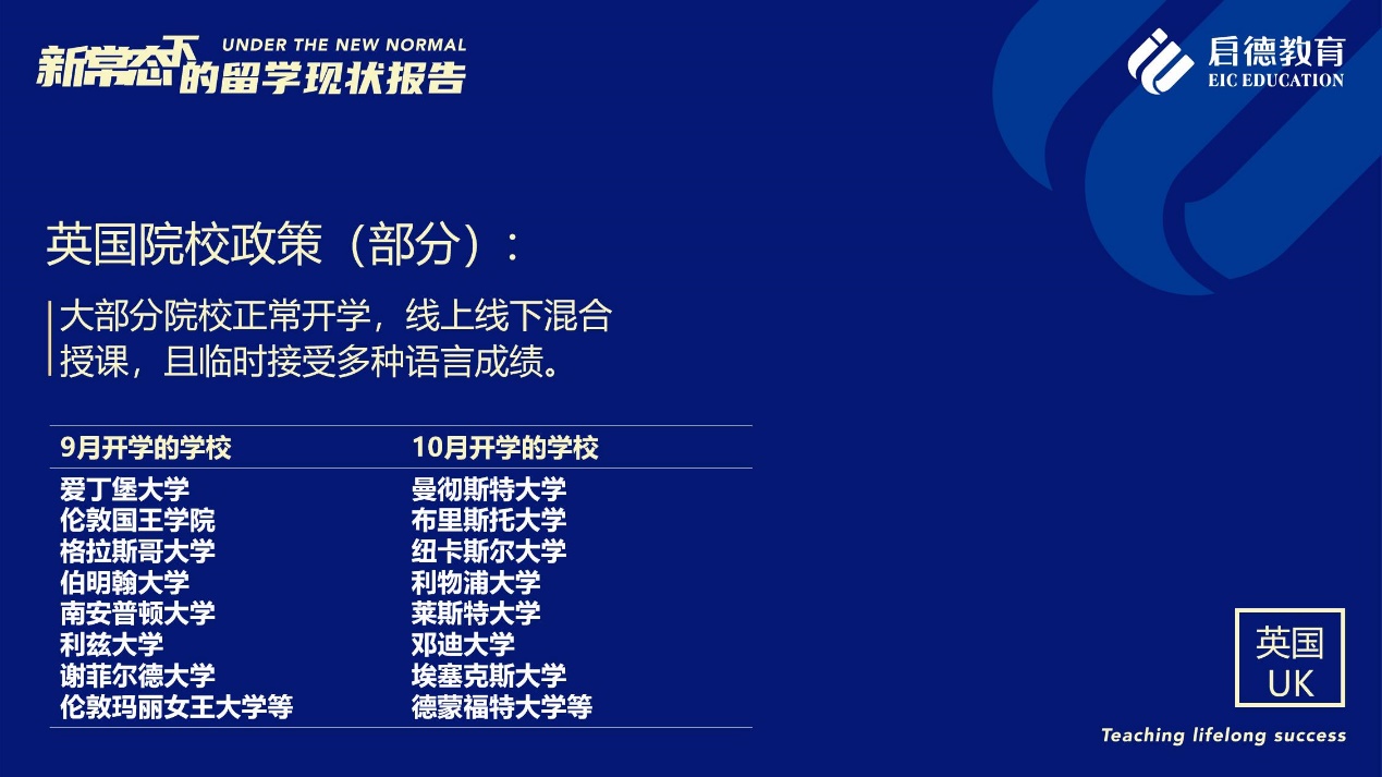《報(bào)告》也梳理了近期各主要留學(xué)目的國(guó)及院校針對(duì)國(guó)際學(xué)生出臺(tái)的各類政策。據(jù)啟德留學(xué)英愛(ài)項(xiàng)目總監(jiān)孫波介紹,國(guó)內(nèi)英國(guó)簽證中心已經(jīng)重新開(kāi)放。準(zhǔn)備赴英讀研的學(xué)生,部分大學(xué)明確表示秋季可以正常開(kāi)學(xué),大課將會(huì)采用線上授課的方式,小班授課線下進(jìn)行;還有部分大學(xué)向?qū)W生提供更加靈活的入讀方案,學(xué)生可以選擇9月入讀或者1月入讀。此外,從2021年開(kāi)始,在英國(guó)完成博士學(xué)位的國(guó)際學(xué)生將會(huì)獲得3年有效期的 PSW工作簽證,本科生和碩士生可以獲得2年有效期的 PSW工作簽證。